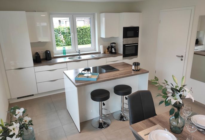 Die offene Küche ist vollständig ausgestattet: Induktionsherd, Backofen, Geschirrspüler, Kühlschrank mit Gefrierfach, Mikrowelle, Kaffeemaschine, Toaster, Wasserkocher und vieles mehr. Alles ist darauf ausgerichtet, Ihnen den Urlaub so angenehm wie möglich zu machen. Im Hauswirtschaftsraum stehen ein Hochstuhl, eine Waschmaschine, ein Wäscheständer, ein Bügelbrett und ein Bügeleisen bereit.