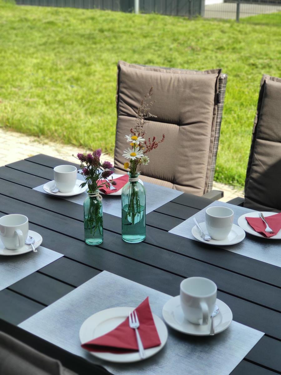 Der Außenbereich umfasst eine überdachte Terrasse mit Sitzmöglichkeiten, ein Gartenhäuschen inklusive eines Grills, eine kleine Grünfläche und genug Platz zum Spielen. Zwei kostenlose Parkplätze befinden sich direkt am Haus.