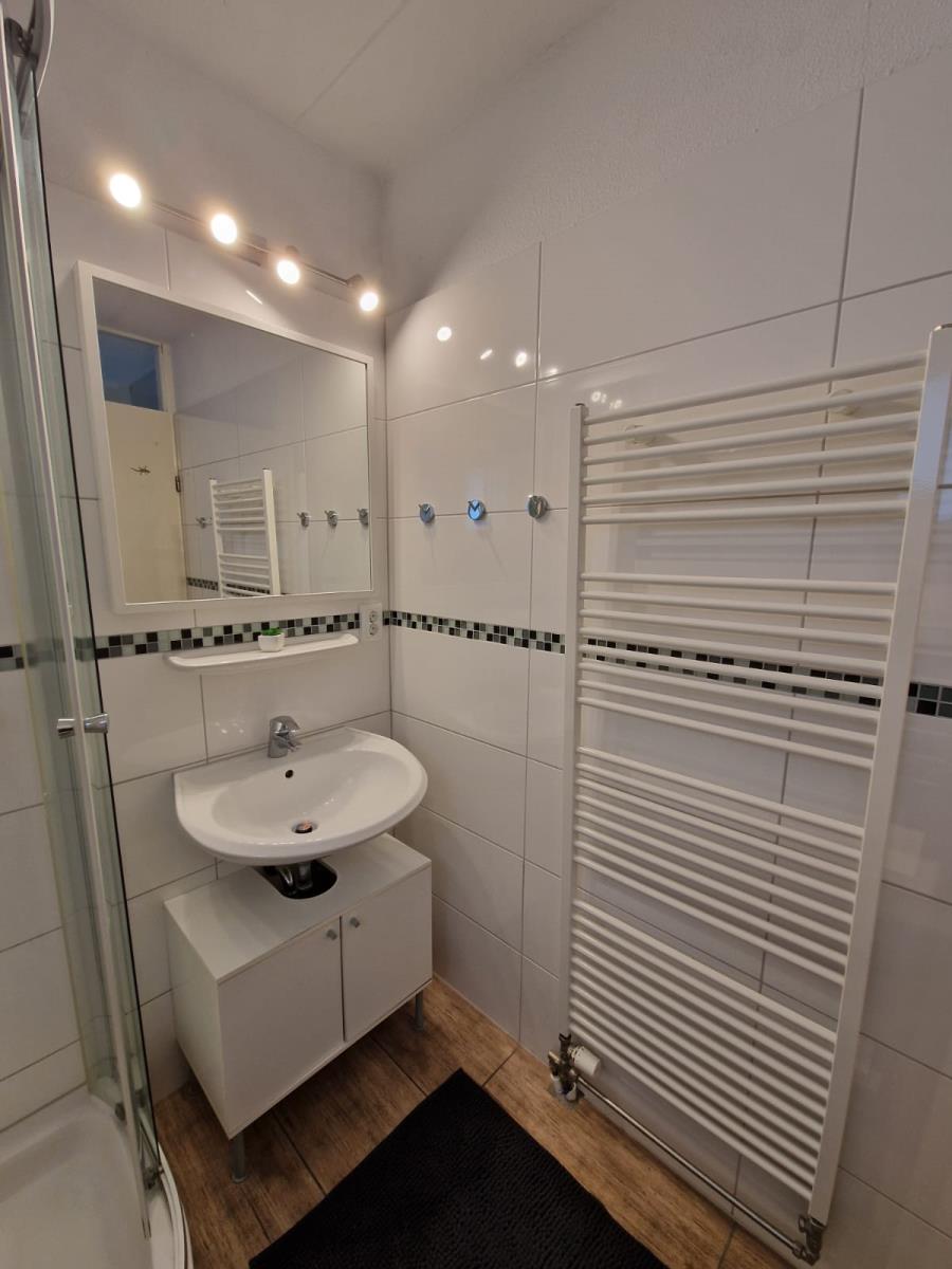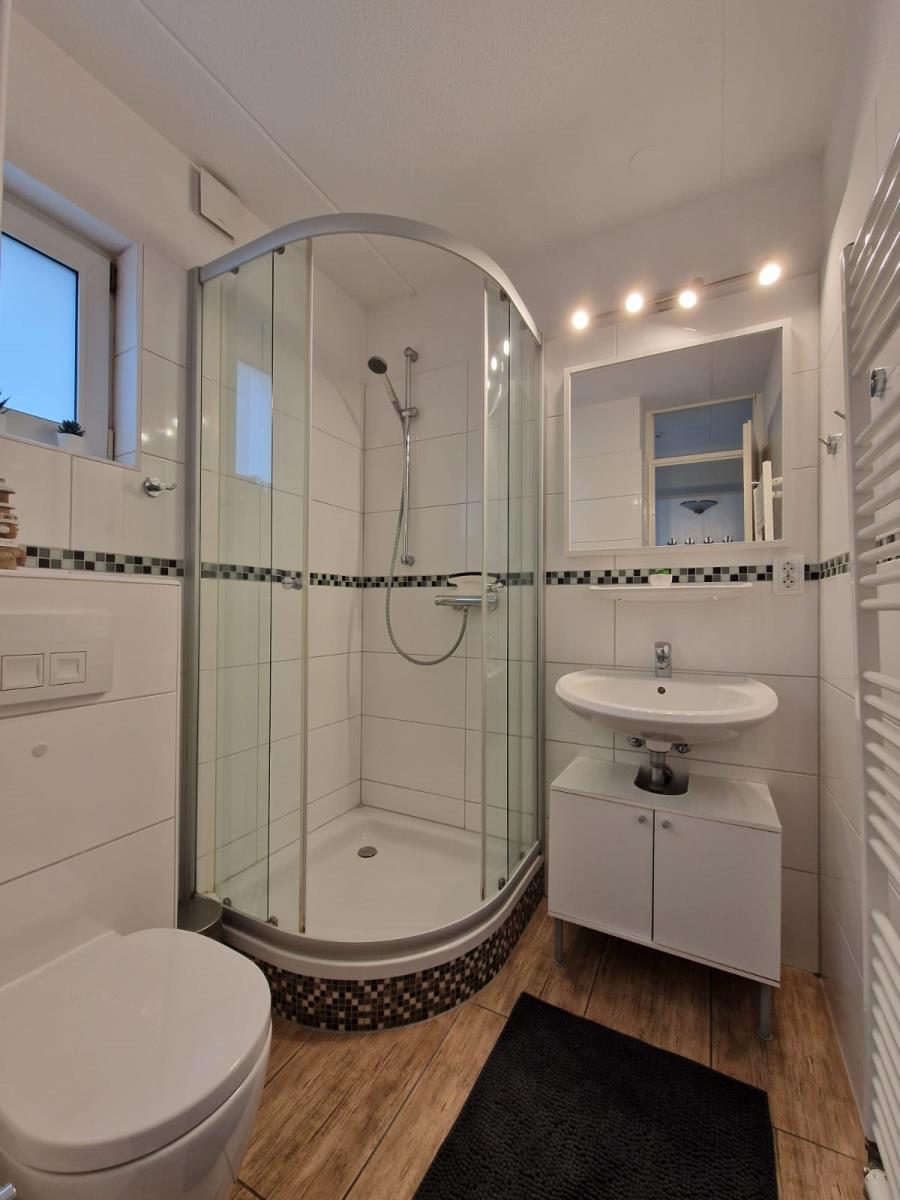 Das helle Tageslichtbad ist mit Dusche, Handtuchheizkörper und Föhn ausgestattet.
